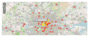 The Monthly Geo Collections map is a representation of a customer’s collections with the details displayed over a map to provide a visualisation of the demographics. Quantity and Material Types are examples of data that is visible. In this particular representation of details the gradient of a more pronounced colour indicates greater number of collections within the selected month. By hovering your cursor or mouse pointer over a circle will display further details.